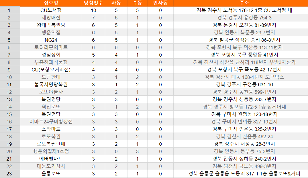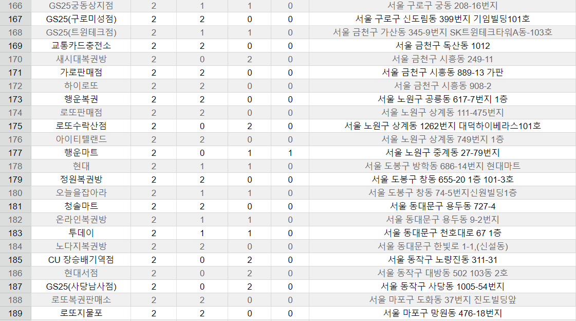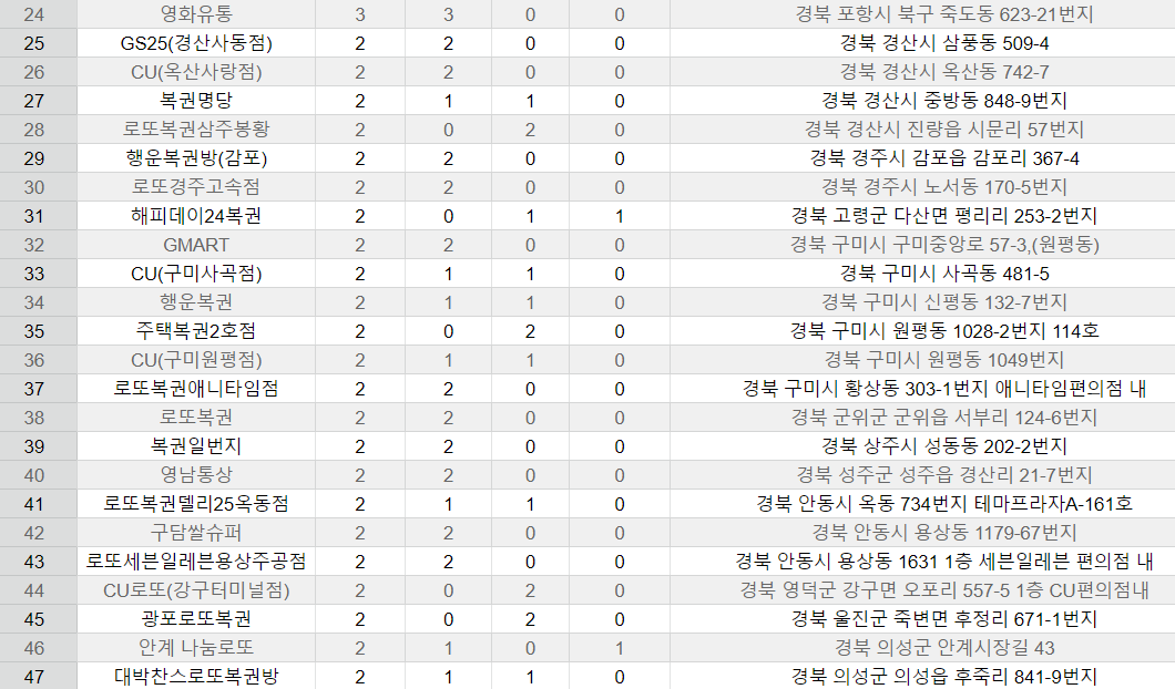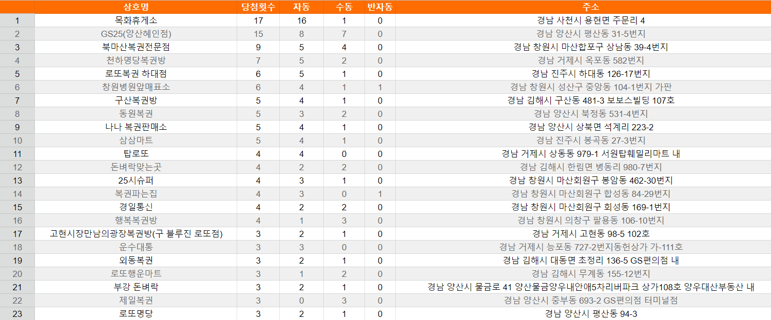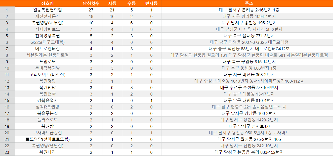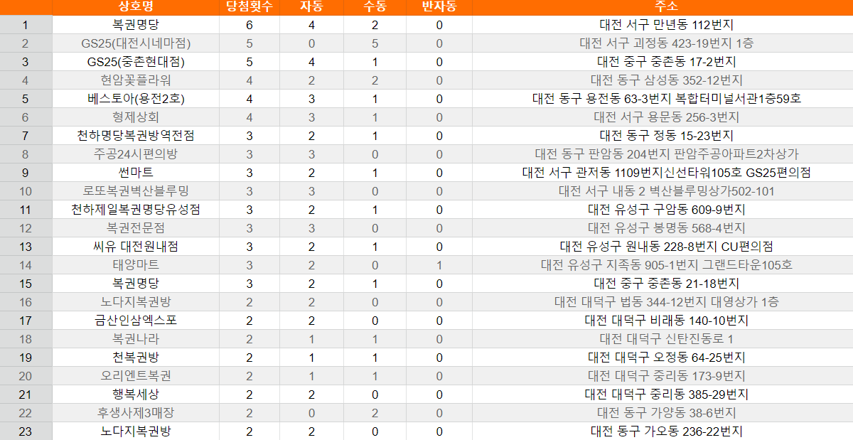 🎁 1등을 2회 이상 배출한 전국 로또 명당 판매점 순위 입니다.