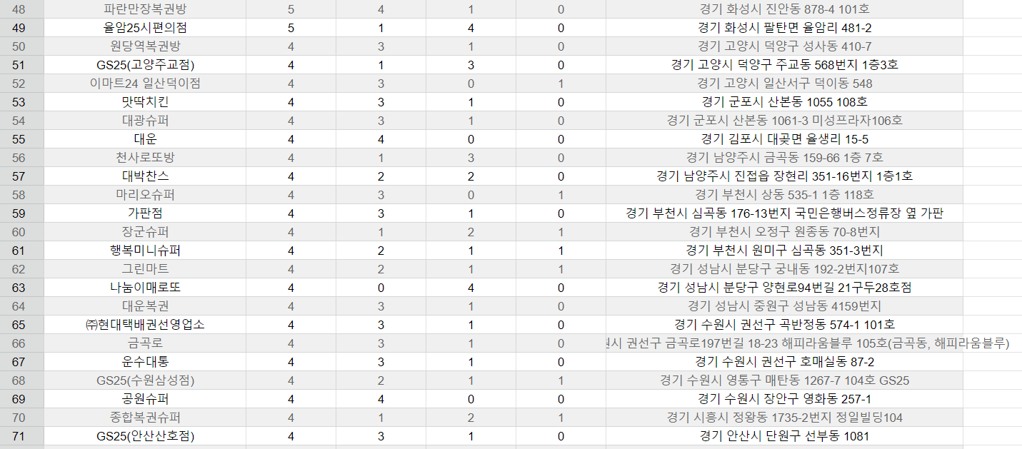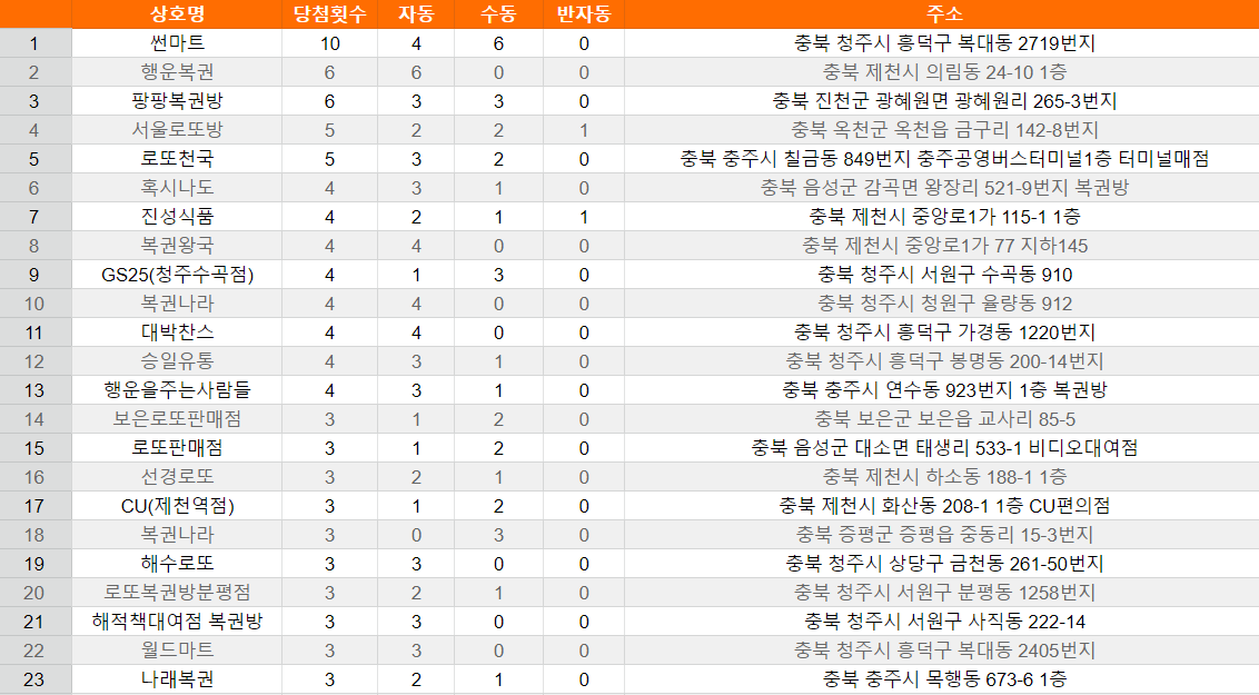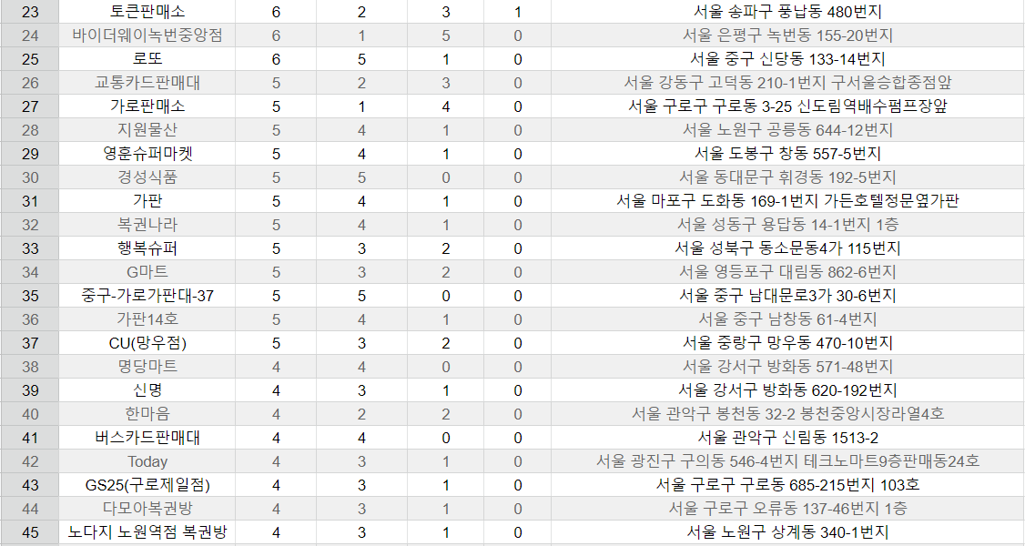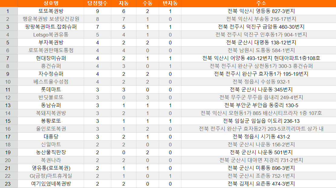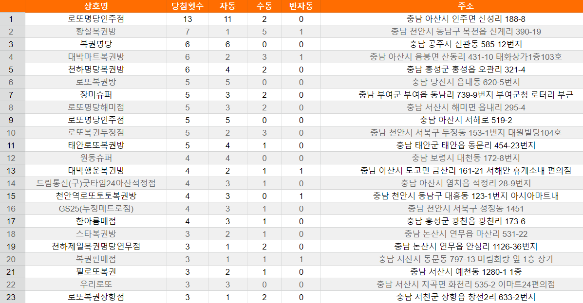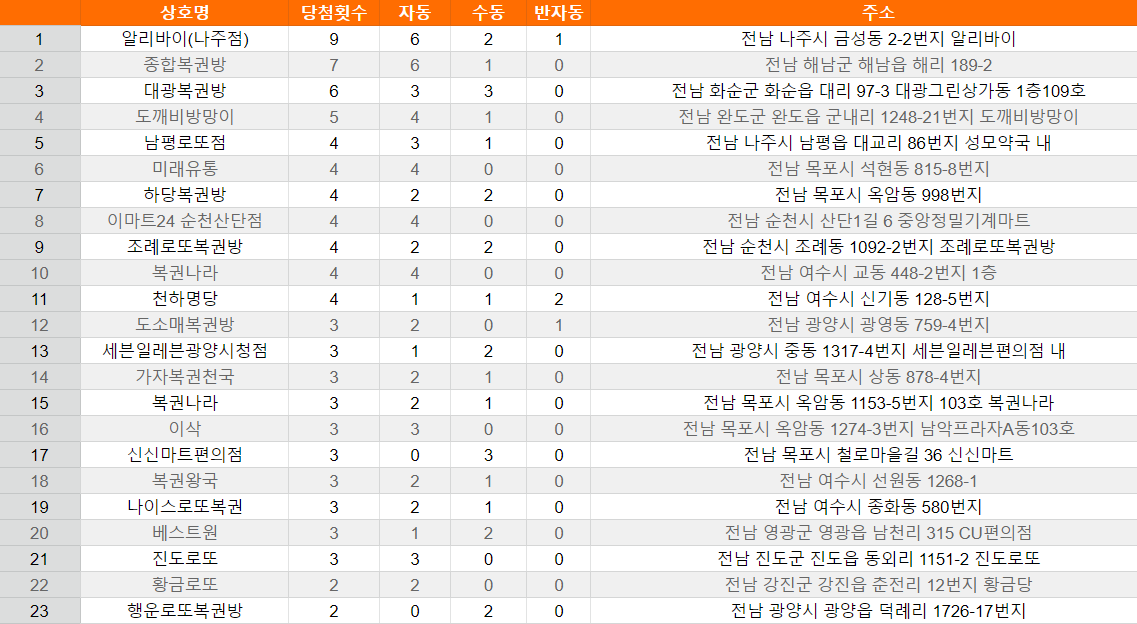 🎁 1등을 2회 이상 배출한 전국 로또 명당 판매점 순위 입니다.