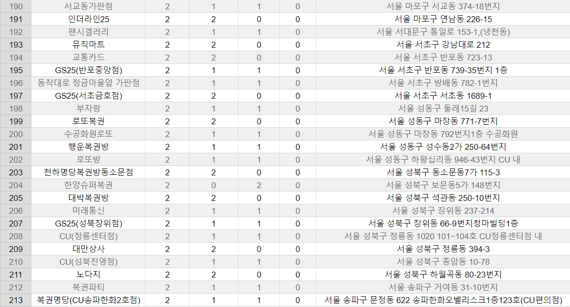 🎁1등을 2회 이상 배출한 서울 로또 복권 명당 판매점 순위입니다.