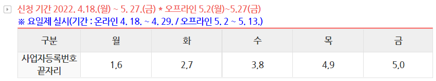 ✅ 오프라인 신청 : 2022.05.02 ~ 5.27 (5/2 ~ 5.27 요일제 실시)