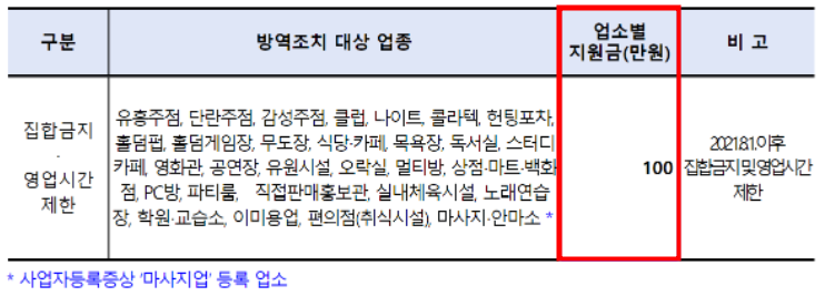 방역조치에 따라 집합금지 또는 영업시간 제한 행정명령을 이행한 소상공인이 대상입니다.