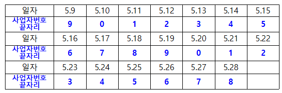 - 1차 기간 : 5월 9일 ~ 5월 28일 (10부제 운영)
