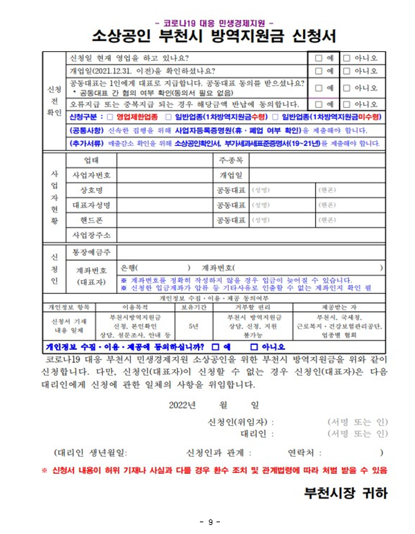 부천시에서 코로나 및 오미크론의 장기화로 인한 방역조치로 인해 경제적 피해를 입은 소상공인 및 소기업에게 방역지원금을 지급합니다. 업체당 100만원을 지급하며 10부제 시행으로 인해 신청일자가 상이하므로 아래 안내를 참고하셔서 신청하시길 바랍니다.