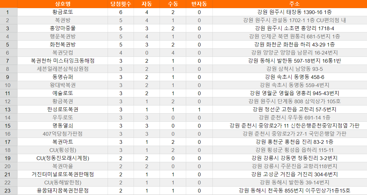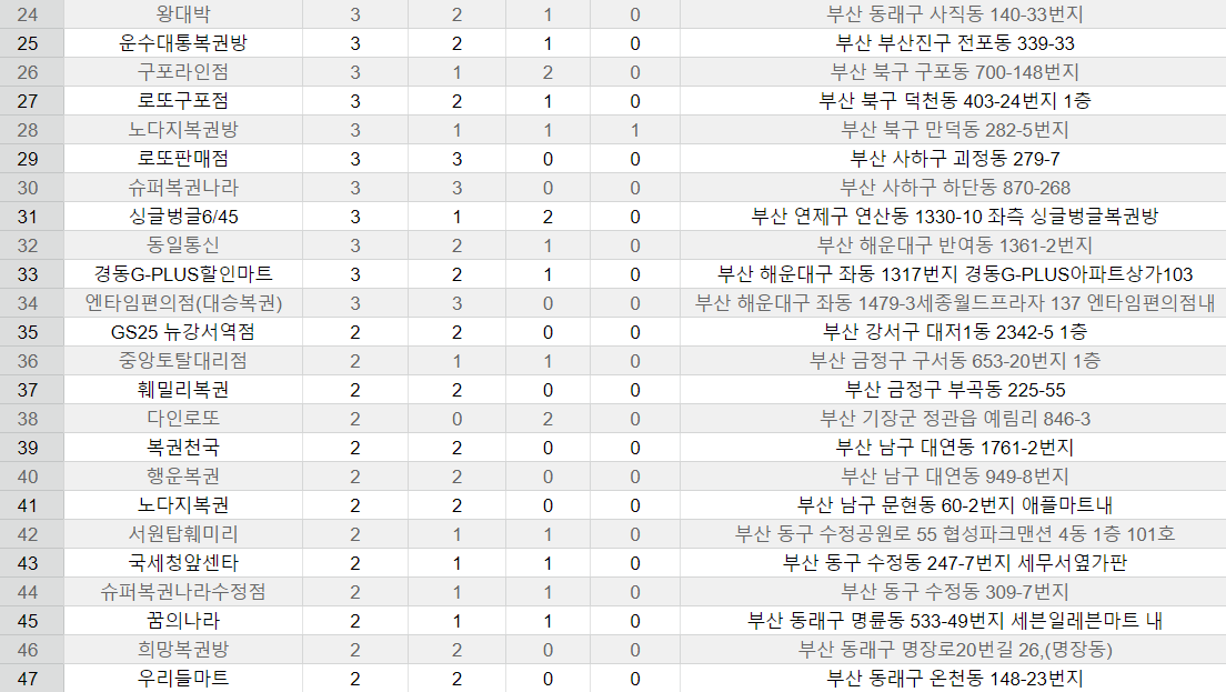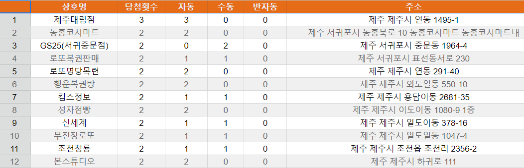🎁 1등을 2회 이상 배출한 전국 로또 명당 판매점 순위 입니다.